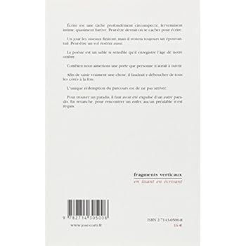 Ecrire est une tâche profondément circonspecte, fervemment intime, quasiment furtive. Peut-être devrait-on se cacher pour écrire. Un jour les oiseaux finiront, mais il restera toujours un épouvantail. Peut-être un vol restera aussi. La poésie est un sable si sensible qu'il enregistre l'âge de notre ombre. Combien nous aimerions une porte que personne n'aurait à ouvrir. Afin de saisir vraiment une chose, il faudrait y déboucher de tous les côtés à la fois. L"unique rédemption du parcours est de ne pas arriver. Pour trouver un paradis, il faut avoir été expulsé d'un autre paradis. En revanche, pour rencontrer un enfer, aucun préalable n'est requis.